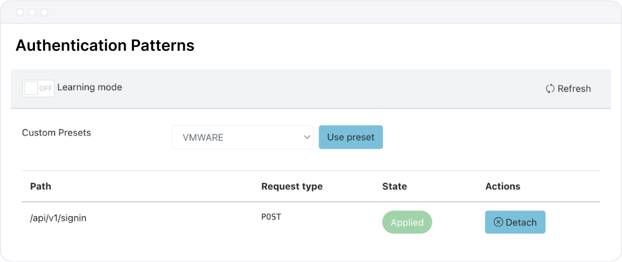 Go back to Secfense Broker GUI and click Refresh in the "Authentication patterns" section. A pattern candidate, represented by its Path and Request type should appear.